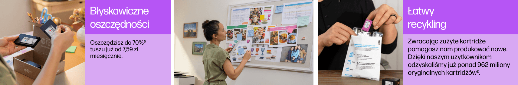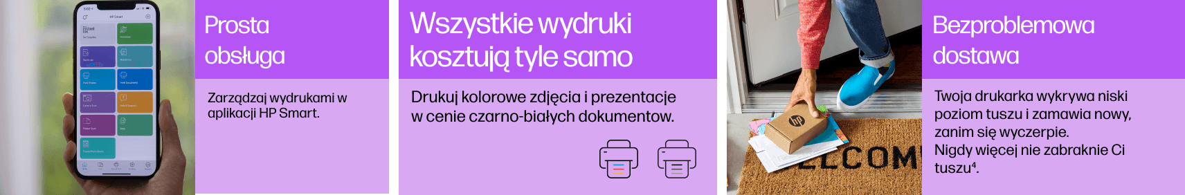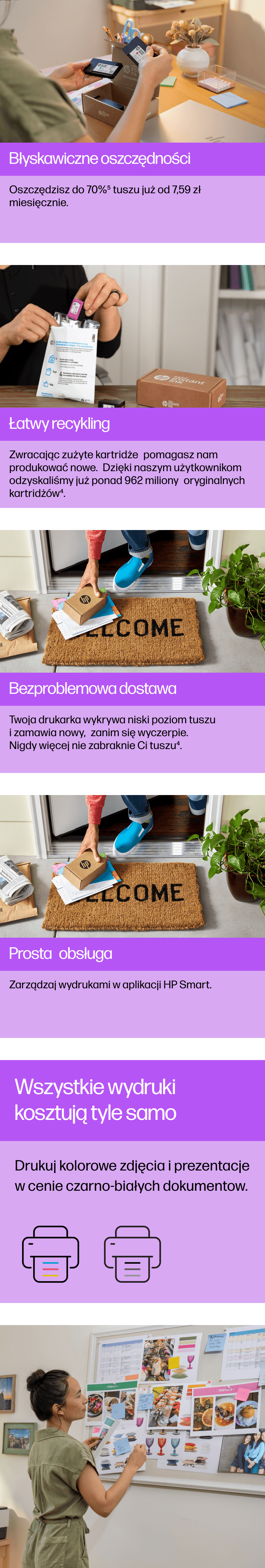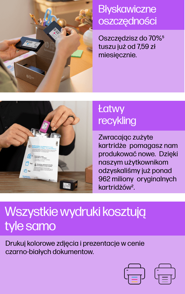 1. Автоматична доставка: для участі в Програма потребує прямого підключення принтера до Інтернету. Є доступ до Інтернету продається окремо. 2. Переробка, деталі: hp.com/recycle. 3. Змінити або скасувати підписку на послугу в будь-який час, деталі: hpinstantink.com/terms. 4. На основі інтенсивності використання плану. Instant Ink вимагає: вибір плану, підключення Інтернет за допомогою відповідного принтера HP, дійсної кредитної/дебетової картки, адреси електронної пошти та послуги доставки в певному географічному регіоні. 5. Економія на Instant Ink (чорнило або тонер), деталі: hp.pl/instantink.