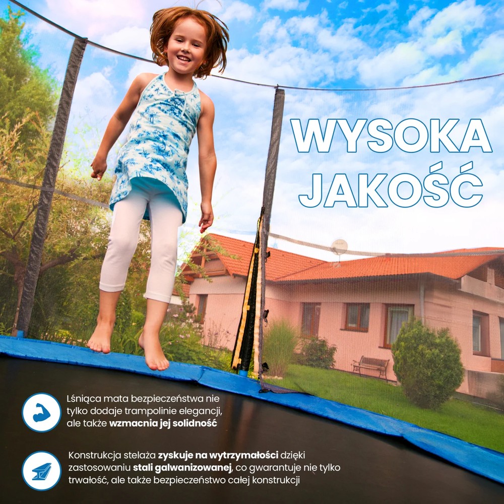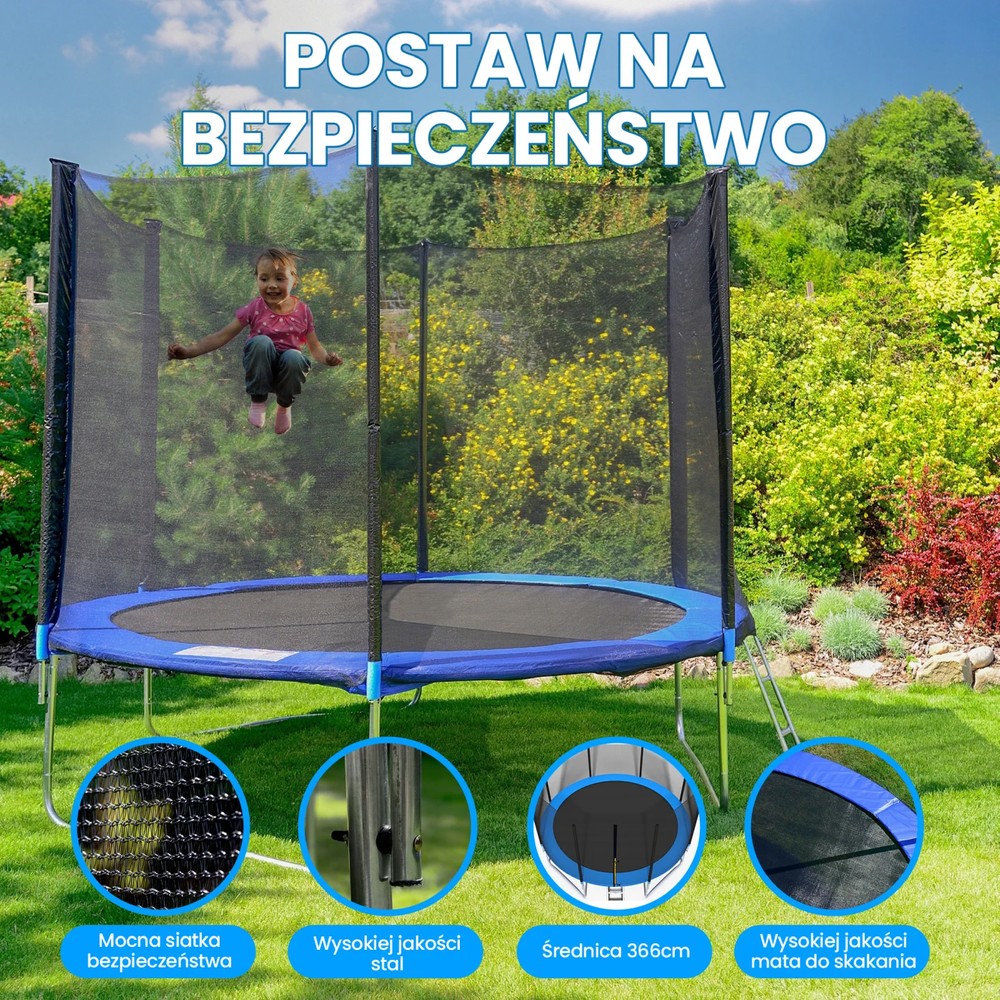 Блискучий захисний килимок не тільки додає батуту елегантності, але й посилює його міцність. Міцність каркасної конструкції набуває завдяки використанню оцинкованої сталі, що гарантує не тільки довговічність, але й безпеку всієї конструкції. Батут має вражаючий діаметр 366 см і висоту 250 см, що робить його вражаючим елементом для ігор на відкритому повітрі.
