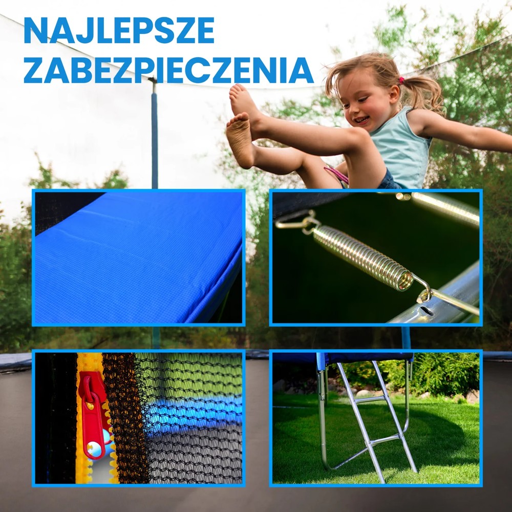 Пріоритетом під час гри на батуті є забезпечення безпеки. Extralink 12FT оснащений захисною сіткою зі зручною блискавкою, що полегшує як входити, так і закривати батут. Сітка була ретельно розроблена, щоб забезпечити оптимальний захист і безпеку під час стрибків, усуваючи страх перед падінням і травмами. Максимальне навантаження 350 кг. Роль пружин у функціонуванні батута дуже важлива, оскільки вони відповідають за утримання килимка в натягнутому стані, що вимагає міцності та надійності. Кришка пружини виконує важливу захисну функцію, перешкоджаючи прямому доступу до них і тим самим підвищуючи безпеку користувачів. До комплекту батута також входить драбина, яка полегшує вхід і вихід.