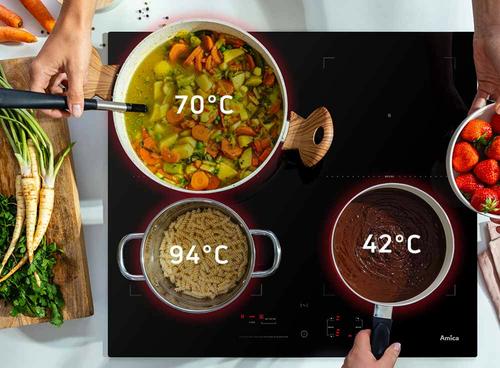 Навіщо експериментувати з температурою нагрівання, витрачати час і ризикувати, що їжа закипить або підгорить? Індукційні плити Amica оснащені рішенням, яке дозволяє швидко встановити температуру відповідно до ваших поточних потреб. 42 ⁰C – ідеальна температура для розтоплення масла чи шоколаду. Ви можете розігрівати суп і соуси до 70 ⁰C. Ви можете варити макарони або рис при 94 ⁰C. Насолоджуйтесь комфортом!
